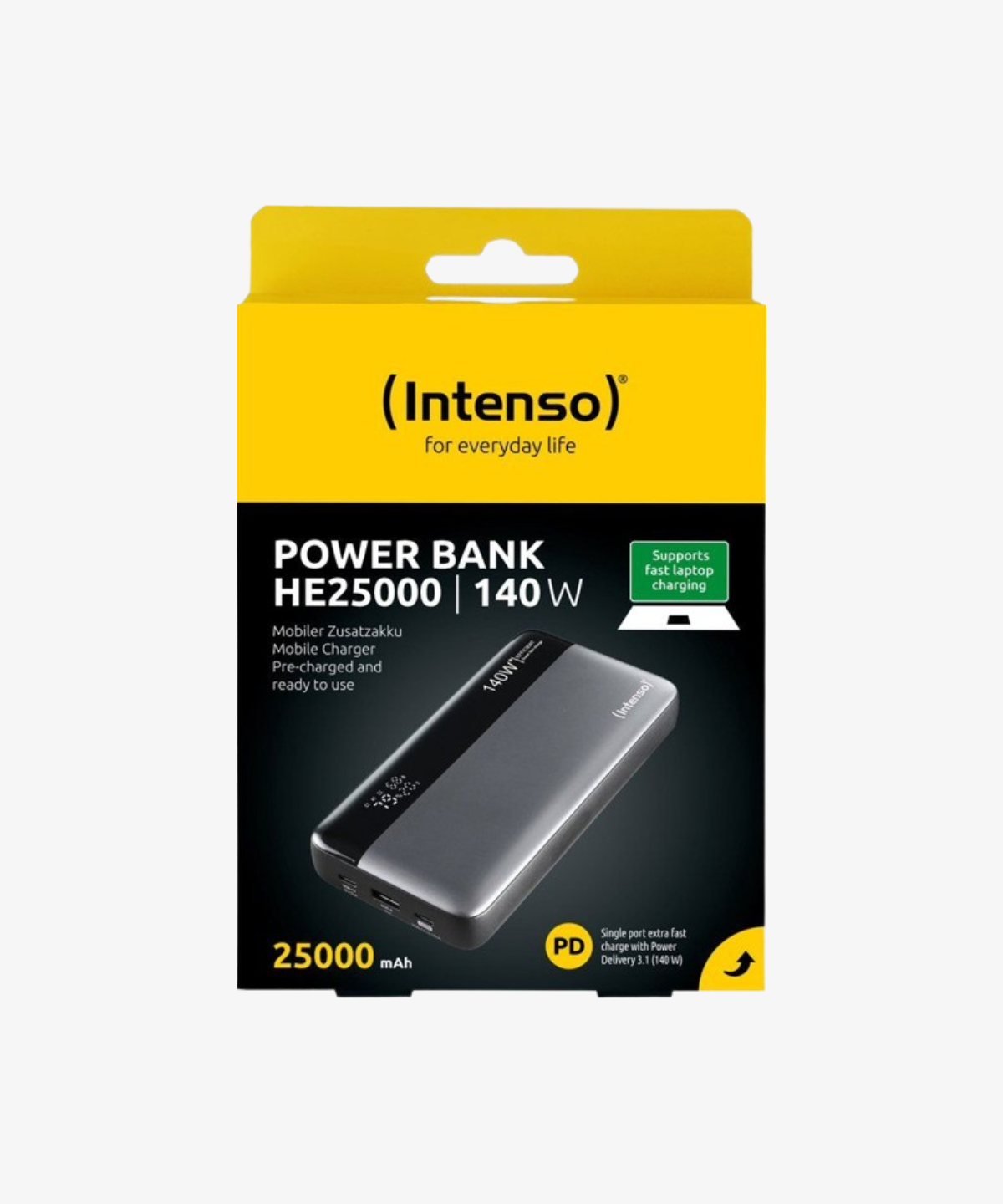 Met de Intenso HE25000 powerbank kun je compatibele apparaten extra snel opladen. Met de veelzijdige aansluitingen, inclusief USB-A en twee USB-C poorten, kun je bijna elk apparaat optimaal opladen. De HE25000 haalt een indrukwekkend vermogen tot 140 watt dankzij de met PD 3.1 uitgeruste USB-C2 poort, ondersteund door de meegeleverde USB-C naar USB-C kabel met geintegreerde E-marker chip. Hierdoor wordt je laptop in recordtijd opgeladen. Met verschillende outputopties past de powerbank zich aan je specifieke oplaadbehoeften aan.